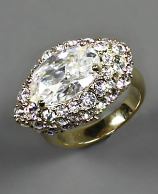 Shiny diamond in gold Givenchy Ring. Over-the-top glamour, made to impress. Givenchy's classic cocktail ring sparkles with a large faceted crystal at center surrounded by round-cut crystals. Set in gold tone mixed metal. Size 7.
